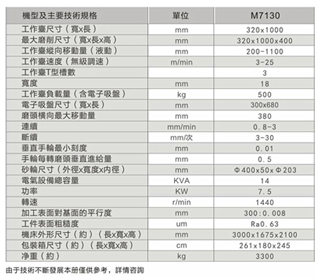 1、本機(jī)床屬于重切削磨床,適用于機(jī)械制造、模具等行業(yè)的平面磨削。可磨削鋼件、鑄件及有色金屬等材料。工件可直接固定在工作臺(tái)面上或放在電磁吸盤(pán)上磨削。